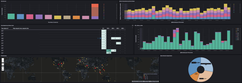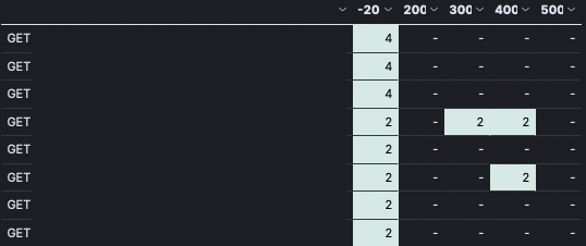 I like this table because it quickly shows what URL is being hit the most often, as well as what status code it tends to return. On the left, I’ve sanitized the URLs from being shown, but one can imagine a list of GET or POST requests with /endpoints/to/some.html