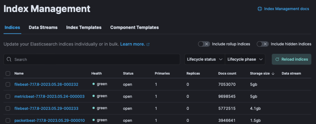 In the screenshot above, I’m sorting by the largest sized indexes. I have some 5G filebeat, metricbeat and a 1.5G packetbeat indexes. In this scenario I’ve set a 5G cap, so the indexes roll over at 5G and after 2 days the old indexes are deleted.