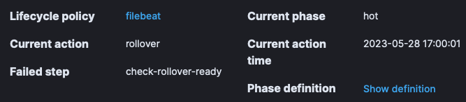 - A side detail pane opens up. Click on the linked Lifecycle Policy (see below screenshot: the “filebeat” link is an example)
