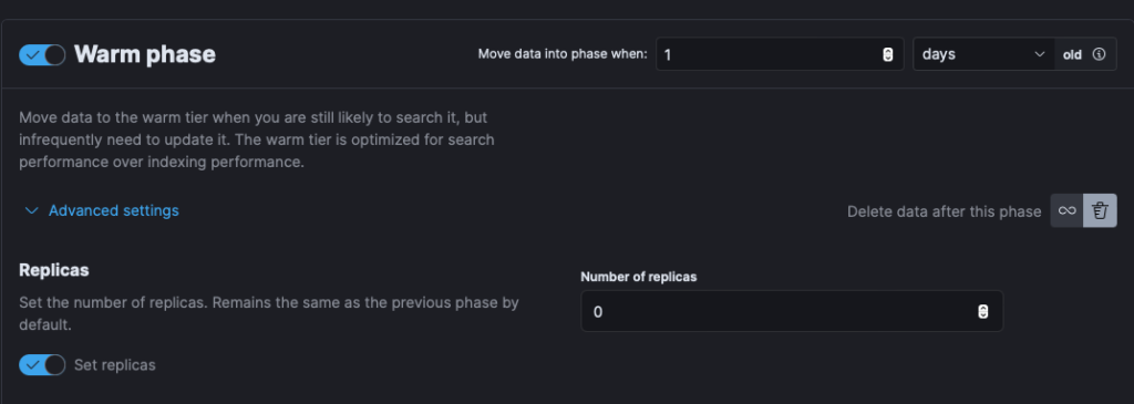 - If your intent is to delete an index in this phase, set the amount of days you want to keep warm (how long to keep the old index), and then check the “Delete Data after this phase” option (see screenshot above).