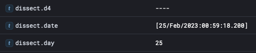 In the above example, we would get a message field inside Kibana, as well as the dissect variable. We would have values such as dissect.month (Feb), dissect.day (22), dissect.year (2023), dissect.time (09:29:00) and so on. If you wanted to plot the values for log levels, you could create a visualization based on dissect.log_levels. Each of the %{} has a variable name which is referenced through the “dissect” method.