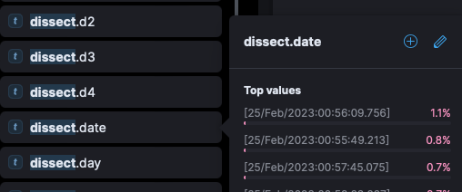 Another way to verify the data, is to create a new Dashboard visualization. On the left side panel, entering dissect in the search box will filter down to specific data elements in the event. Again, the dissect data is appearing for me. Clicking on the field, will spawn a side menu with data values for that field: